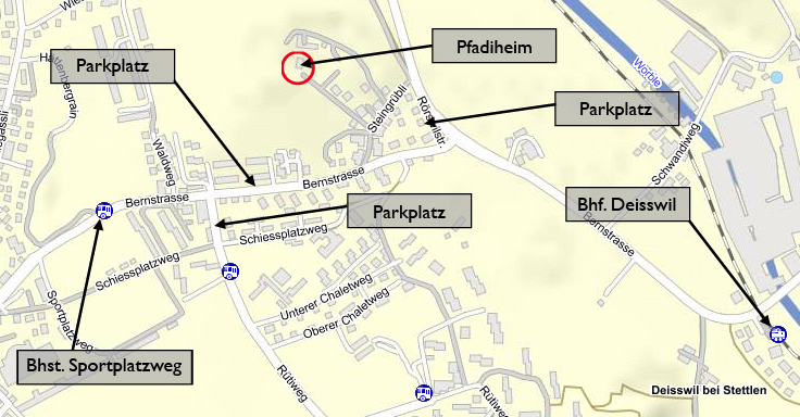 Bahn Mit RBS Bähnli S7 ab Hauptbahnhof Bern in Richtung Worb bis zum Bahnhof Deisswil. Entlang der Haupstrasse in Richtung Ostermundigen (600m), bei der Kreuzung nach links abbiegen (Bernstrasse), nach 80m nach rechts in Steingrüebliweg abbiegen, und schliesslich dem Wegweiser entlang zum Pfadiheim folgen (ca. 12min).